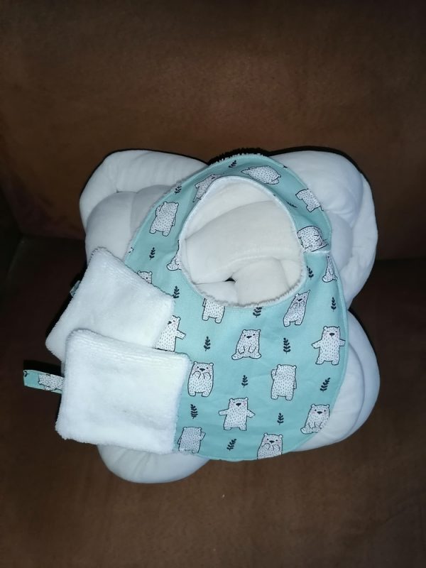 Bavoir en tissu coton imprimé doublé d’éponge bambou et ses deux lingettes débarbouillantes en éponge bambou.