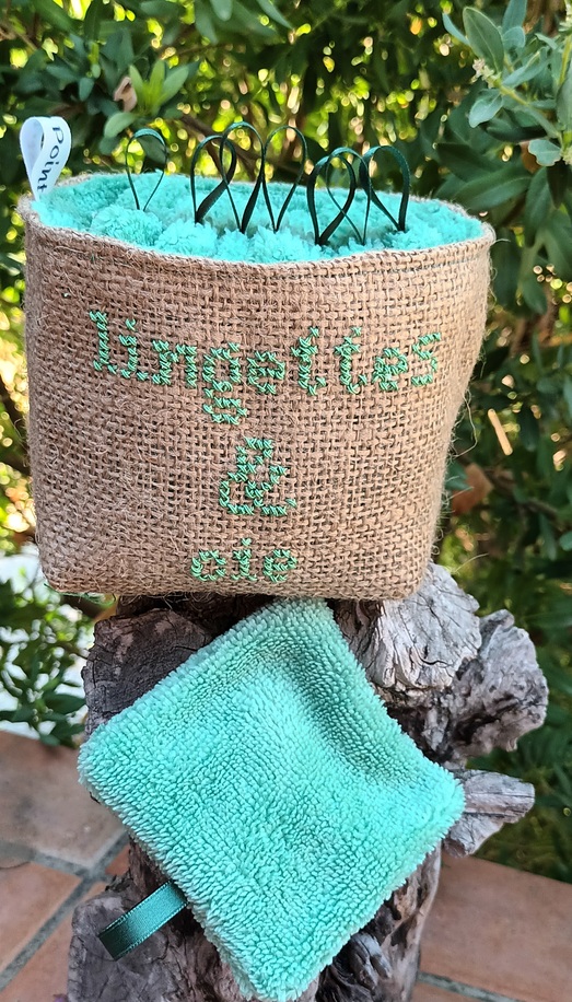 Panier en toile de jute brodée aux points de croix et ses 8 lingettes démaquillantes en éponge bambou.