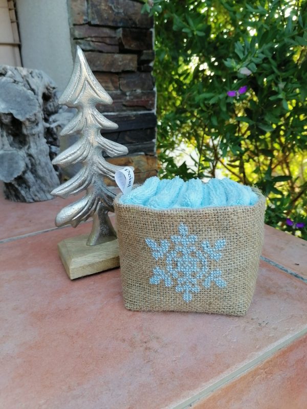Apportez une touche de fraîcheur à votre routine de soins avec notre panier de lingettes démaquillantes « Flocon Hivernal ». Ce panier, fabriqué en toile de jute naturelle, est décoré d’un magnifique flocon de neige brodé, évoquant l’élégance de l’hiver. Il contient des lingettes en éponge douce de couleur bleu glacier, idéales pour un démaquillage doux et respectueux de votre peau.