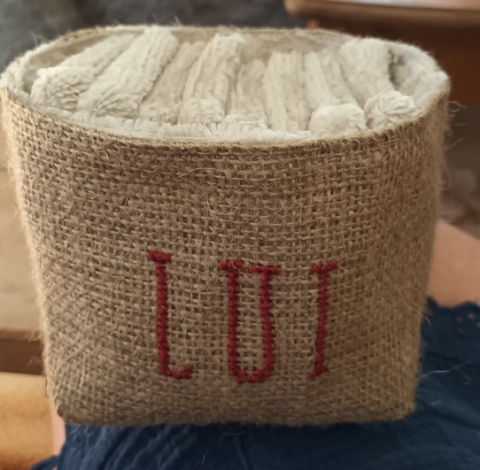 Panier en toile de jute brodée aux points de croix doublé d’éponge bambou et ses 8 lingettes démaquillantes en éponge bambou.