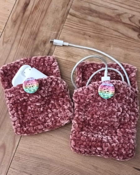 Pochettes tricotées main avec bouton fantaisie réalisées dans un fil chenille, pour abriter vos chargeurs de téléphone et vos écouteurs.